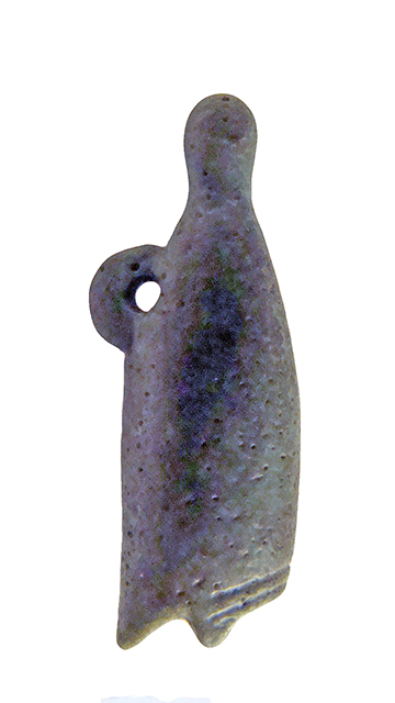 Amuleto in faience lavorato a tutto tondo, con anello di sospensione nella parte posteriore. Raffigura la corona bianca dell'Alto Egitto, simbolo di autorità nell'oltretomba (come quella che il faraone aveva in vita).