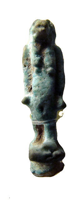 Amuleto in faience raffigurante la divinità apotropaica Toeris, patrona delle partorienti e dei neonati. La dea è raffigurata in piedi, con il muso di coccodrillo, una lunga parrucca, il corpo da ippopotamo gravido, con le braccia distese lungo il corpo. I piedi poggiano su una base parallelepipeda, mentre il dorso con la coda da coccodrillo si fonde con il pilastro dorsale, forato per permettere la sospensione dell'amuleto.