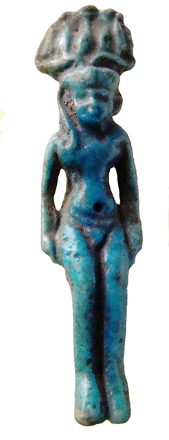 Amuleto in faience raffigurante il dio Arpocrate: il dio fanciullo è ritratto nudo, semidisteso. Dietro il collo vi è un anello di sospensione. I tratti iconografici che lo contraddistinguono sono la treccia infantile che scende sul lato destro del capo e il braccio destro piegato per portare l’indice alla bocca (che in questo esemplare, invece, è insolitamente disteso lungo il corpo). Normalmente sulla fronte è presente un ureo e sul capo vi è una corona atef multipla. Arpocrate è una divinità bambina il cui culto avrà molta fortuna nelle epoche finali della storia egiziana, ed è considerato figlio di Iside ed Osiride.