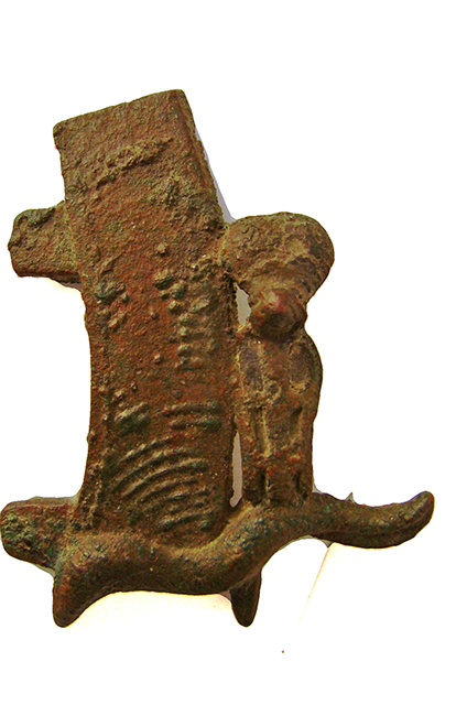 Elemento in bronzo che raffigura una piuma di struzzo che poggia su un corno ondulato di ariete; di fianco alla piuma si vede un ureo con disco solare. Il lato sinistro della piuma presenta due tenoni piatti, che servivano per inserire questo elemento decorativo nella parte centrale di una corona atef, probabilmente nell'ambito di una statua di Osiride. La parte superiore della piuma di struzzo, dal caratteristico ricciolo, è spezzata e attualmente mancante.