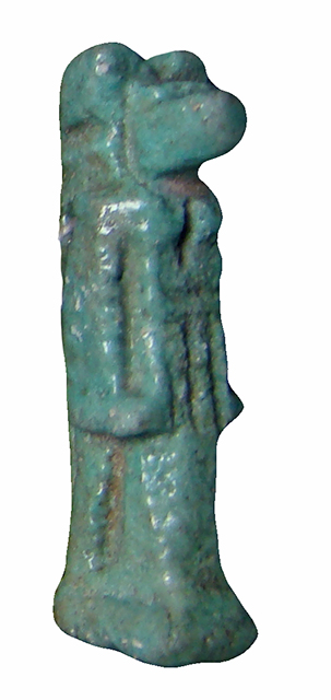 Amuleto in faience raffigurante il dio Anubi. Il dio dalla testa di sciacallo è raffigurato in piedi, nell’atto di camminare (con la gamba destra in avanti) e con le braccia stese lungo i fianchi; le mani sono chiuse a pugno. Le orecchie sono molto evidenti, così come il muso canino allungato. Indossa un corto gonnellino pieghettato. Data la minutezza della figura, i piedi poggiano su una piccola base parallelepipeda, mentre sul retro vi è il pilastro dorsale, che presenta un foro passante.