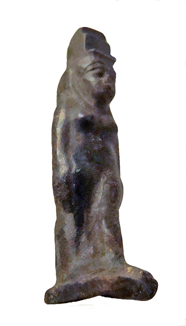 Amuleto in lapislazzulo che raffigura Iside, in piedi, nell'atto di camminare (ha la gamba sinistra in avanti). Sul capo porta il geroglifico del suo nome, sopra la gonfia parrucca che ricade sulle spalle. Le braccia sono distese lungo il corpo, e i piedi poggiano su una piccola base, che continua sulla schiena a formare il pilastro dorsale.