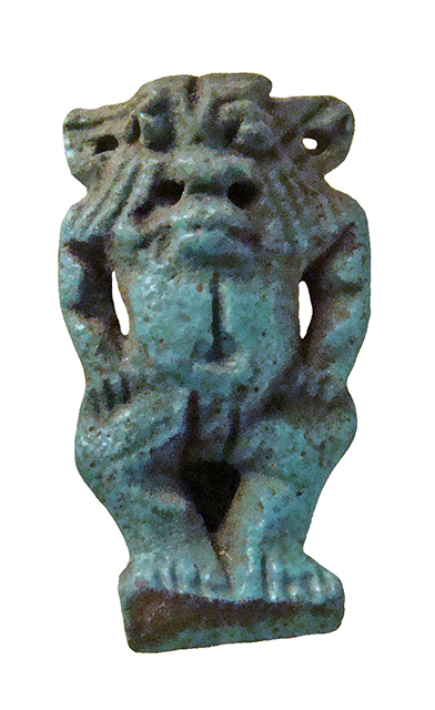 Amuleto in faience raffigurante la divinità apotropaica Bes. Il dio è raffigurato nel suo aspetto consueto: con il corpo tozzo e le gambe arcuate, le braccia appoggiate sulle cosce, il volto frontale con le orecchie sporgenti, le sopracciglia evidenziate, la barba e il grande naso piatto. Sul capo manca la consueta corona di piume di struzzo, mentre i piedi poggiano su una piccola base quadrangolare.
