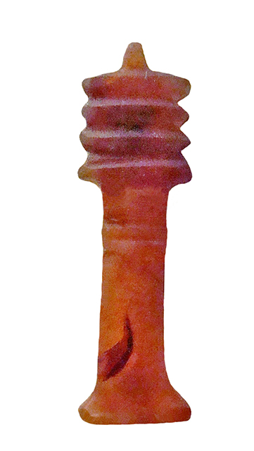 Amuleto in corniola, privo di foro di sospensione, che raffigura il geroglifico "djed", a forma di pilastro con quattro espansioni nella parte superiore, che indica stabilità, immutabilità, eternità, resurrezione, ma anche forza inestinguibile ed incorruttibilità. Già nella Prima Dinastia (3150 – 2925 a.C.) era un pilastro intorno al quale venivano legate spighe di grano; dal Nuovo Regno (1543 – 1078 a.C.) fu interpretato anche come spina dorsale di Osiride. Un djed, meglio se in oro, era posto sulla gola del defunto durante il suo funerale, con il compito di farlo divenire uno spirito santificato e perfetto, un seguace di Osiride. Nel capitolo 155 del Libro dei Morti l’amuleto fa sì che “è tua nuovamente la tua spina dorsale e le tue vertebre, così che puoi tornare a muoverti...”.