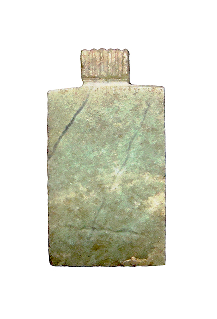 Amuleto in pietra lavorato a tutto tondo, raffigurante una tavoletta per scrivere liscia e rettangolare, con presa superiore priva del foro per la sospensione. Amuleti di questo tipo si diffusero a partire dalla XXVI dinastia (dal VII secolo a.C.).