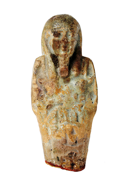 Frammento superiore di statuina funeraria che indossa una parrucca tripartita e una barba divina intrecciata. I tratti del volto sono finemente modellati, le mani, incrociate sul petto, reggono una zappa e un piccone. Sotto le braccia si intravede l'inizio di un'iscrizione geroglifica, purtroppo incomprensibile. Sulla schiena è presente il pilastro dorsale.