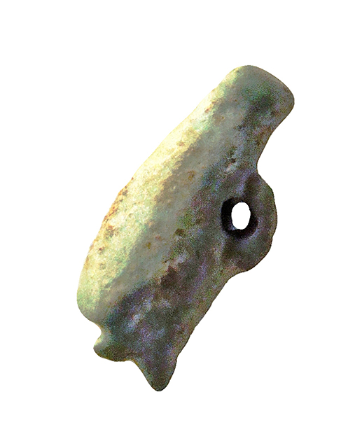Amuleto in faience lavorato a tutto tondo, con anello di sospensione nella parte posteriore. Raffigura la corona bianca dell'Alto Egitto, simbolo di autorità nell'oltretomba (come quella che il faraone aveva in vita).