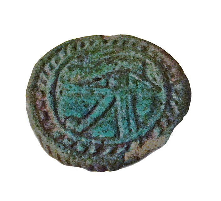 Piastrina circolare in faience, con bordo seghettato e foro passante, con funzione di amuleto. Raffigura, all’interno di una cornice con motivo a corda, su una faccia il volto della divinità apotropaica Bes, frontale con le orecchie sporgenti, le sopracciglia evidenziate, la barba e il grande naso piatto. Sul capo porta una corona di piume di struzzo. Sulla faccia opposta, sempre all’interno di una cornice uguale all’altra, vi è l'immagine di un occhio udjat.