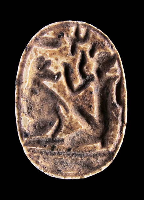 Scarabeo in steatite grigia con sul ventre una rappresentazione del faraone inginocchiato in atto di adorazione davanti al dio Thot in forma di babbuino. Sopra di essi dei segni geroglifici non leggibili, probabilmente il nome del sovrano. Dorso con clipeo sulla testa e incisione a T che separa il protorace dalle elitre, sulle quali sono incise tacche a V; in basso è visibile lo scutello. Foro passante longitudinale.