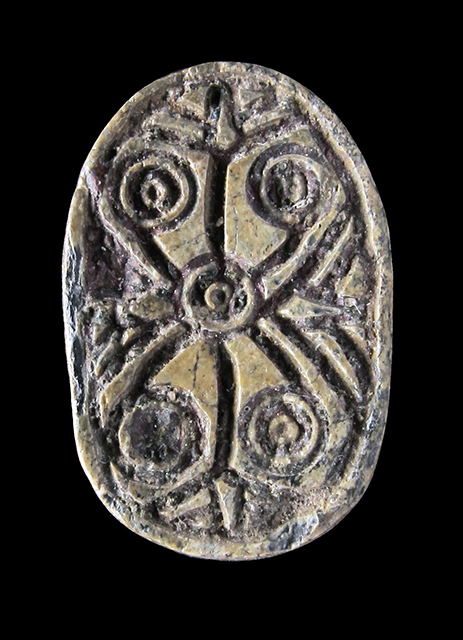 Scarabeo in steatite grigia, con sul ventre incisione di motivo geometrico con schema a croce, alle cui estremità vi sono dei fiori di loto. Sul dorso è segnata solo la testa con il clipeo. Foro passante longitudinale.