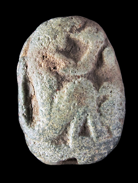 Scaraboide in faience con sul ventre rappresentazione di divinità con disco solare e piuma. Dorso con incisione di una scimmia che suona uno strumento a fiato, con un elemento decorativo vegetale davanti (capovolto rispetto alla decorazione del ventre). Il colore originale doveva essere azzurro. Foro passante longitudinale.