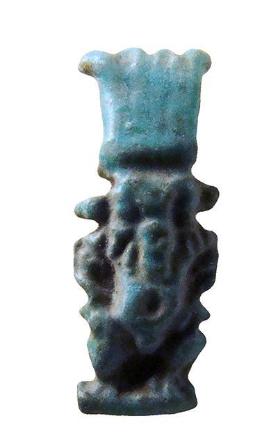 Amuleto in faience raffigurante la divinità apotropaica Bes. Il dio è raffigurato nel suo aspetto consueto: con il corpo tozzo e le gambe arcuate, le braccia appoggiate sulle cosce, il volto frontale con le orecchie sporgenti, le sopracciglia evidenziate, la barba e il grande naso piatto. Sul capo porta una corona di piume di struzzo, mentre i piedi poggiano su una piccola base quadrangolare. Presenta un foro passante all'altezza della corona.