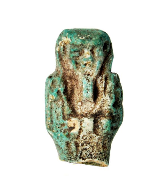 Frammento superiore di statuina funeraria mummiforme, che indossa la parrucca tripartita e la barba divina, le mani sono incrociate sul petto e reggono una zappa ciascuna. Per quanto si può vedere, sotto le mani comincia una colonna d'iscrizione geroglifica, purtroppo illeggibile.