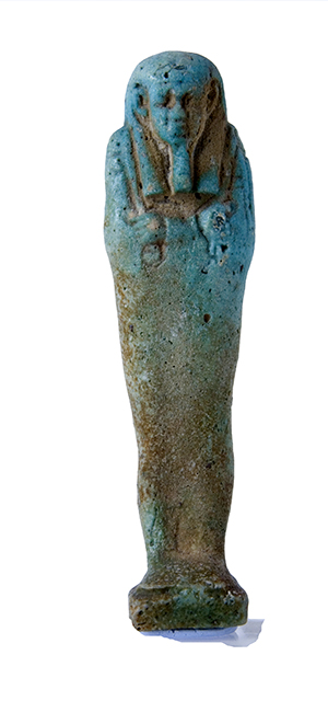 Statuina funeraria mummiforme che indossa una parrucca tripartita e la barba divina. Le mani incrociate e affiancate tengono a destra una zappa e a sinistra un piccone. Dalla spalla sinistra pende una sacca. Il pilastro dorsale e la base sono presenti. L’ushabti è privo di iscrizioni.