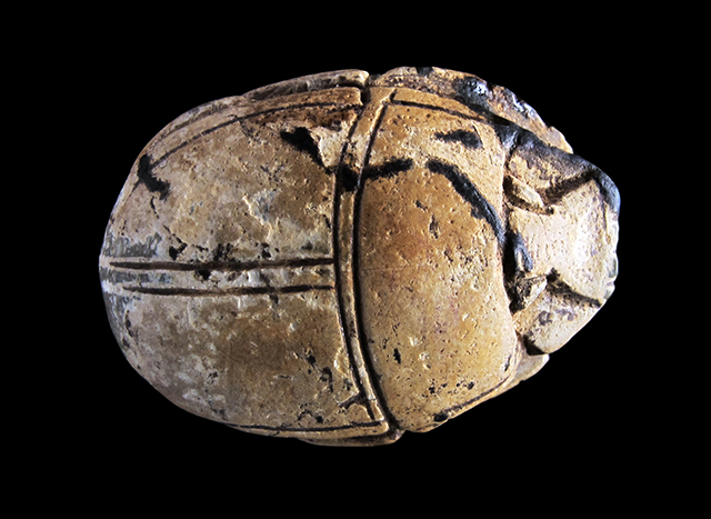 Scarabeo in steatite grigia con sul ventre la rappresentazione di un cavallo davanti al quale vi è forse una nebride (pelle animale appesa ad un bastone: è uno dei simboli di Osiride). In alto vi sono dei segni geroglifici di lettura incerta. Dorso con clipeo e doppia incisione a T che separa protorace dalle elitre, visibili le zampe ripiegate lateralmente. Foro passante longitudinale.
