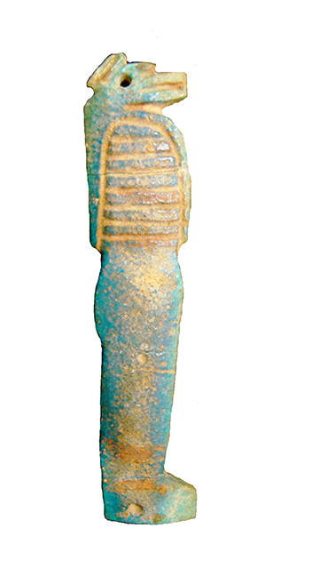 Amuleto in faience, dallo spessore così ridotto da risultare quasi una piastrina, che veniva cucito sulle bende delle mummie. Raffgura il profilo del corpo mummiforme del genio funerario Hapi, caratterizzato da una testa di babbuino, attraverso la quale vi è il foro per il fissaggio alle bende, mentre il secondo foro è visibile nella zona dei piedi.
