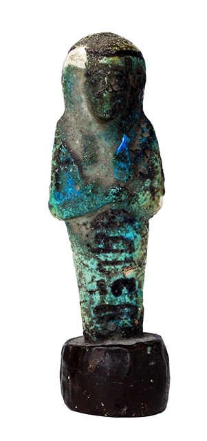 Parte superiore di statuina funeraria mummiforme che indossa la parrucca tripartita con il seshed. Le braccia sono incrociate sul petto, la destra sulla sinistra, e le mani reggono entrambe una zappa. Dietro la spalla sinistra pende quella che sembra essere una zappa. Sotto le braccia parte la colonna di iscrizione, che non è completamente visibile dal momento che l'ushabti è irremovibilmente infisso in una base cilindrica non originale. Tutti i dettagli sono resi con dipintura in nero.