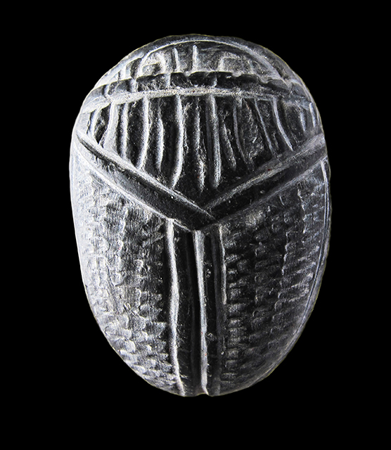 Scarabeo anepigrafe in basalto. Dorso stilizzato, sulla testa è appena accennato il clipeo. Si nota una doppia incisione a Y per dividere il protorace, che presenta delle striature verticali, dalle elitre, le quali mostrano una lavorazione ad onda. Senza foro. Autenticità dubbia.