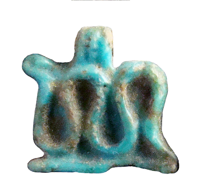 Amuleto in faience, modellato a rilievo, con anello di sospensione nella parte superiore. Raffigura un serpente dal corpo ondulato che forma tre spire sinuose, rivolto verso sinistra; il corpo del serpente poggia su una piccola base.