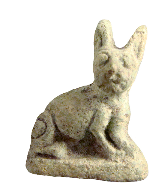 Amuleto in faience lavorato a tutto tondo, raffigurante un gatto dalle grandi orecchie seduto su una piccola base; la testa del gatto è girata verso destra; all'altezza del collo vi è un foro passante.