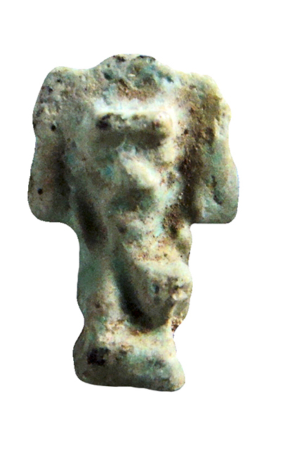 Amuleto in faience raffigurante il dio dell'aria Shu, dalla superficie alquanto rovinata. Il dio è raffigurato inginocchiato, con indosso un gonnellino e con le braccia alzate simmetricamente a reggere un disco solare sopra il capo. I piedi poggiano su una piccola base parallelepipeda, che dietro si sviluppa nel pilastro dorsale, forato per permettere la sospensione dell'amuleto.