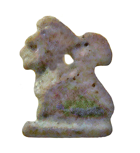 Amuleto in faience lavorato a tutto tondo in modo alquanto stilizzato, raffigurante un gatto dalle grandi orecchie seduto su una piccola base; all'altezza del collo vi è un foro passante.