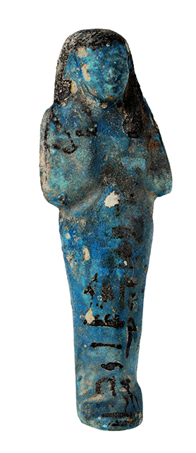 Statuina funeraria in faïence turchese dal colore molto acceso. L’iconografia è quella tipica: la statuina raffigura il defunto mummiforme, stante, con le braccia incrociate sul petto. La parrucca, le due zappe che tiene in mano e il sacco per le sementi sulla schiena sono resi in nero, come l’iscrizione che corre in colonna lungo la parte frontale del corpo.
