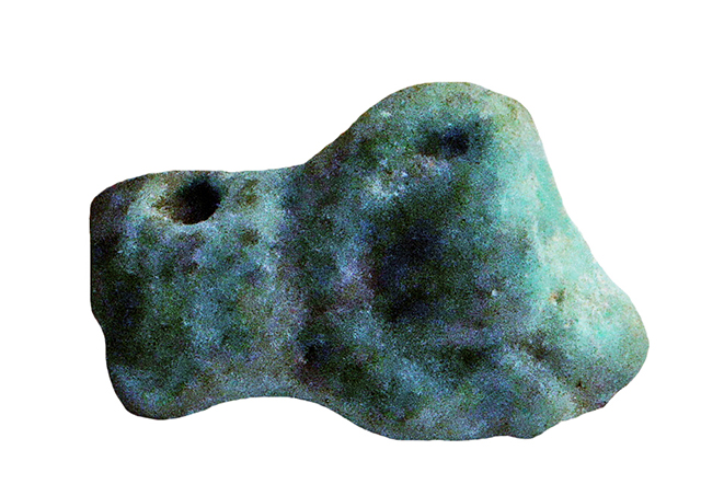 Amuleto in faience lavorato a tutto tondo, raffigurante un pugno chiuso. Nella porzione del polso è ricavato un foro passante. Un amuleto di questo tipo garantiva a chi lo portava forza e destrezza nelle attività manuali.