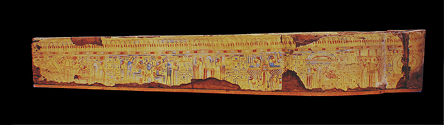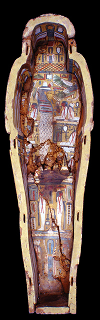 La moltitudine delle immagini, distribuite in vignette alternate a colonne di geroglifici, così come i testi stessi, ripropongono il culto del dio Osiride e del sole, affermando l’idea del viaggio eterno dell’astro, a cui la defunta partecipa essendo ella stessa una parte del grande dio. Puntuali confronti con sarcofagi custoditi presso il Museo nazionale di Napoli, il British Museum e il Petrie Museum di Londra, evidenziano la sua appartenenza al gruppo dei cosiddetti “yellow coffins”, datato alla fine della XXI dinastia e in uso particolarmente nell’ambito della casta sacerdotale di Amon a Tebe. Si tratta di un sarcofago femminile, come è dimostrato dai seni, riconoscibili sotto le bande della parrucca, dalla particolare lunghezza di queste ultime, dal fatto che le orecchie non sono visibili e dal colore del volto. I testi geroglifici della cassa non riportano il suo nome (a meno che non si trovasse nella porzione ormai illeggibile del testo del coperchio) e questa circostanza, riscontrata anche in altri esemplari simili, risulta essere un’altra caratteristica della fine della XXI dinastia. La proprietaria fu probabilmente una sacerdotessa di Amon vissuta nella zona tebana.