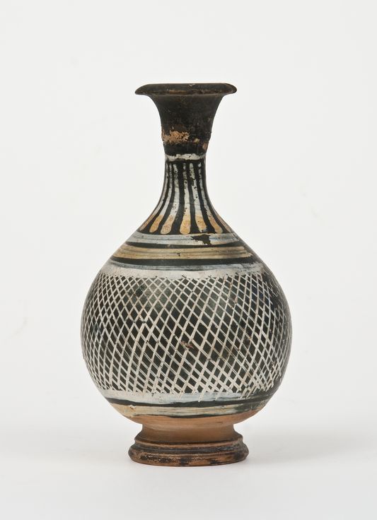 Bombylios o unguentario a bottiglia a vernice nera lucente con sovraddipinture in bianco e giallo. Bocchello campanulato, stretto collo a profilo concavo, corpo globulare, quasi sferico, bassa gola di raccordo, piede troncoconico con taglio modanato, fondo apicato. Sul collo tra una sottile linea e una fascia, dipinte in bianco, bastoncelli verticali, in bianco e, nella parte terminale, in giallo. Sulla spalla fascia in giallo; sul corpo motivo a reticolo con maglie romboidali sovraddipinto in bianco, inquadrato superiormente e inferiormente da linee dello stesso colore. Alla base della pancia, infine, fascia irregolare dipinta in bianco.