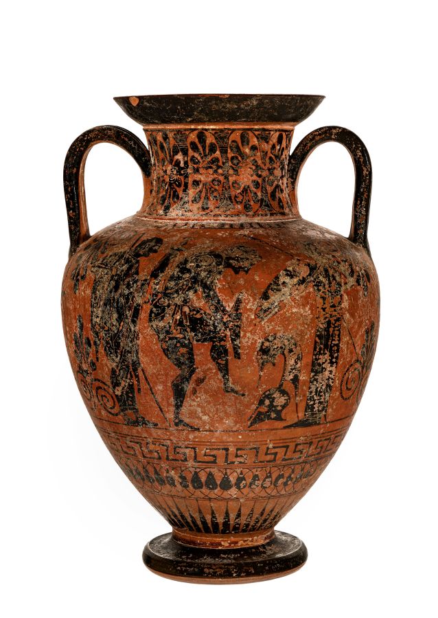 Anfora a figure nere con colori aggiunti e graffito. Lato A: Una quadriga è raffigurata di prospetto: sul carro si intravede l’auriga e alle sue spalle un guerriero con elmo corinzio che impugna due giavellotti e il kentron. Lato B: Un uomo anziano stante si appoggia a un bastone e porge una spada al giovane guerriero, armato di corazza, che si china per indossare il secondo schiniero, mentre il suo elmo attico è ancora a terra; a destra, una donna gli porge la lancia e lo scudo concavo. Sotto la base è inciso il marchio con lettere in legamento: HP