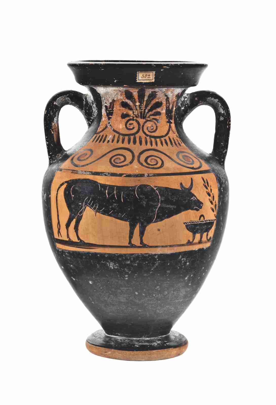 La forma dell'anfora è affine a quella delle anfore campaniformi attiche di tipo B; l'orlo è svasato e modanato, e si attesta su un corto collo cilindrico, dal profilo convesso. Le anse a bastoncello si impostano verticalmente tra il collo e la spalla, poco rilevata, e il corpo ovoide, molto rastremato verso il fondo, poggia su un piede ad echino rovesciato semplice. La vernice nera, piuttosto lucida, è uniforme e copre tutta la superficie del vaso, compreso l'interno del collo, fatta eccezione per i due spazi decorati e una fascia risparmiata alla base del piede; alcuni dettagli della decorazione secondaria presentano inoltre sovradipinture rosse. Il colore dell'argilla è Munsell 7.5YR 5/4 (brown). La decorazione principale del lato A presenta, in un riquadro, limitato in alto da una linea nera, un bovino, fermo e perfettamente di profilo, ma con le gambe in posizione sfalsata, tutte perfettamente visibili; le corna sono a mezzaluna, mentre la lunga coda è biforcuta. Sono rappresentati anche i dettagli della muscolatura, del costato e dei genitali. A destra della scena troviamo un louterion, con una presa centrale in alto e l'orlo decorato, e un ramo d'ulivo, che spunta la bordo destro del riquadro; una linea nera fa da appoggio al motivo figurato. Il lato B presenta un semplice fregio vegetale limitato da due linee nere, composto da tre palmette, una delle quali sborda dal riquadro risparmiato, intervallate da coppie di boccioli di loto; dai boccioli si dipartono due tralci a spirale, che si incontrano alla base delle palmette andando a costituire delle volute. La decorazione accessoria su spalla e collo è pressoché simmetrica sui due lati del vaso, con un motivo a doppia spirale contrapposta sulla spalla, arricchito da un punto rosso al centro delle spirali (meno accurato sul lato B, poiché una della spirali sborda dal riquadro riservato alla decorazione), limitato alla base del collo da una sequenza di linguette nere. Sul collo troviamo nuovamente il motivo a palmette e boccioli di loto, analogo a quello presente sul riquadro del lato B, con una palmetta centrale con volute affiancata dai boccioli. Sull'orlo, sul lato A, è presente una vecchia etichetta, recante un precedente numero di inventario ('852').