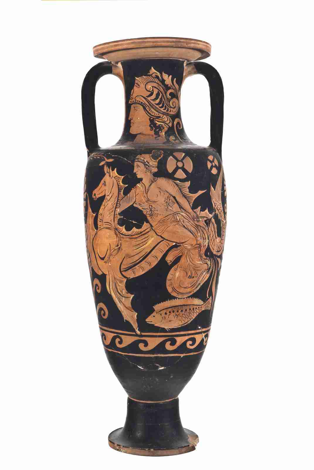 L'anfora presenta un corpo ovoide allungato, rastremato verso il basso e con spalla pronunciata; il collo non è particolarmente lungo, ha un profilo convesso, mentre l'orlo, estroflesso, è semplice, con ampio labbro e modanatura a cavetto. Il vaso poggia, con un corto stelo, su un piede a disco semplice, con listello superiore. Le anse, ritorte, si impostano verticalmente tra la spalla e la sommità del collo, poco sotto l'orlo. La vernice nera è opaca e uniforme e risparmia lo spigolo del labbro, una fascia sotto l'orlo, il collo dietro alle anse, un filetto all'attaccatura dello stelo e lo spigolo del piede, mentre in nero è l'interno del collo; sono inoltre presenti dettagli sovradipinti in giallo. Il colore dell'argilla oscilla tra Munsell 5YR 6/4 (light reddish brown), 5YR 5/4 (reddish brown) e 2.5YR 4/4 (reddish brown). Il lato A è dominato dalla grande figura di una nereide in groppa ad un ippocampo: entrambe le figure sono e-stremamente accurate, con drappeggi e anatomia molto dettagliati e naturalistici, lumeggiature in giallo e om-breggiature rese con tratti paralleli in nero. La nereide ha il volto di profilo a sinistra, con i capelli raccolti in un sakkos dal quale esce uno chignon; il torso è di tre quarti, le gambe probabilmente accavallate, completamente nascoste dalla veste. Indossa ciò che sembra essere un chitone smanicato, decorato da motivi floreali e con un lembo svolazzante dietro le spalle; le gambe sono nascoste da un himation drappeggiato ed ornato da ricche pieghe, con l'orlo inferiore decorato da un motivo a coppie di linee parallele . Il braccio destro cinge il collo dell'ippocampo, mentre il sinistro è disteso lungo il corpo, con la mano sproporzionatamente piccola. L'ippocampo è perfettamente di profilo a sinistra e occupa tutta la larghezza del lato A; la pinna destra è alzata, la sinistra distesa verso il basso. Una lunga cresta appuntita arriva fino alla coda, biforcuta e da pesce, ricoperta di squame al di là della nereide. L'anatomia è accurata, il ventre reso con coppie di linee arcuate. In basso, sotto la nereide, un pesce, di profilo, con lunga cresta dorsale, squame e una fila di punti neri sulla parte alta del corpo. In alto a sinistra, come riempitivo, compare un tralcio fogliato, mentre a destra troviamo due fiori stilizzati a quattro petali, con lumeggiature in giallo. Sul lato B troviamo una canonica scena di dialogo tra due giovani ammantati: quello a sinistra è di profilo a de-stra, stante, con i capelli piuttosto lunghi che ricadono sulla nuca e cinti da un serto sovradipinto in giallo; il torso è frontale, la gamba sinistra portante e la destra flessa, con il piede frontale. L'abito è più simile ad una lunga tu-nica smanicata o ad un chitone che ad un himation, ma è comunque sorretto dal braccio sinistro, mentre la mano sinistra è infilata tra le pieghe dell'abito e si intravede sotto ad esse, come fosse in tasca. Le pieghe dell'abito sono molte e rese con piccoli tratti e, come per l'altro giovane, presentano lumeggiature in giallo. Ai piedi il giovane porta dei calzari. Il giovane a destra è completamente avvolto nel mantello, stante, perfettamente di profilo a sinistra; Fuoriescono soltanto i piedi e la testa, analoga a quella dell'altro giovane, con capelli lunghi e cinta da serto. L'orlo dell'himation è sottolineato da una linea nera e, oltre alle pieghe, è reso anche un lembo dell'orlo interno, reso con un reticolo di sottili linee nere. Come l'altro giovane, indossa delle calzature. Tra le due figure troviamo un alto elemento vegetale a girale e, tra le due teste, ciò che sembra un pinax, reso tridimensionalmente con una sovradipintura gialla. Sui due lati del collo compaiono due teste di profilo: sul lato A, la testa è galeata, di profilo a sinistra; Il mento è particolarmente pronunciato, e un ciuffo di capelli ricci copre l'orecchio. L'elmo, reclinato all'indietro o di tipolo-gia apulo-corinzia, presenta una ricca decorazione, con un volto di profilo sul davanti e il retro in forma simile ad un pesce, terminante in una spirale; il bordo inferiore è decorato da una fila di punti neri. A destra troviamo alcuni elementi vegetali: in alto delle foglie d'acanto, che sfiorano l'elmo e, in basso, due girali. La testa del lato B è femminile, di profilo a sinistra e anch'essa con mento pronunciato e i capelli raccolti in un sakkos riccamente ornato da punti neri di diversa dimensione e orli sottolineati da fasce nere; un piccolo ciuffo di capelli fuoriesce dall'acconciatura all'altezza dell'orecchio. I gioielli, sovradipinti in giallo a simulare il metallo prezioso, compren-dono un diadema ornato da due file di perline, orecchini e una collana a perline gialle e nere. I motivi decorativi accessori comprendono, sulla spalla, un tralcio di alloro destrorso e, sotto al motivo figurato, un fregio a onde marine destrorse tra due filetti risparmiati. Tra le figure di lato A e lato B, troviamo un motivo vegetale con palmette e girali fogliati. Sulla parte superiore dell'orlo è attaccata una vecchia etichetta (“allegato 438”), mentre l'attuale numero di in-ventario generale è scritto sia all'interno del collo che sotto al piede.