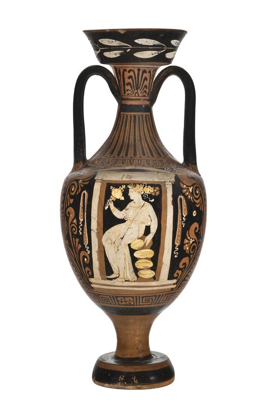 Anfora panatenaica a figure rosse con elementi sovradipinti in bianco e giallo. Alto labbro svasato; collo stretto; breve spalla arrotondata; corpo ovale; alto stelo su ampio piede troncoconico; anse a nastro impostate fra il centro del collo e la spalla. Sul labbro ramo d'alloro; palmette sovrapposte fra girali con foglie; inferiormente meandro interrotto da rettangoli con croce e puntini. Lato A: defunta in chitone seduta su roccia all'interno di un'edicola con specchio in mano. Lato B: scena di offerta: donna stante con phiale e serto a corona.