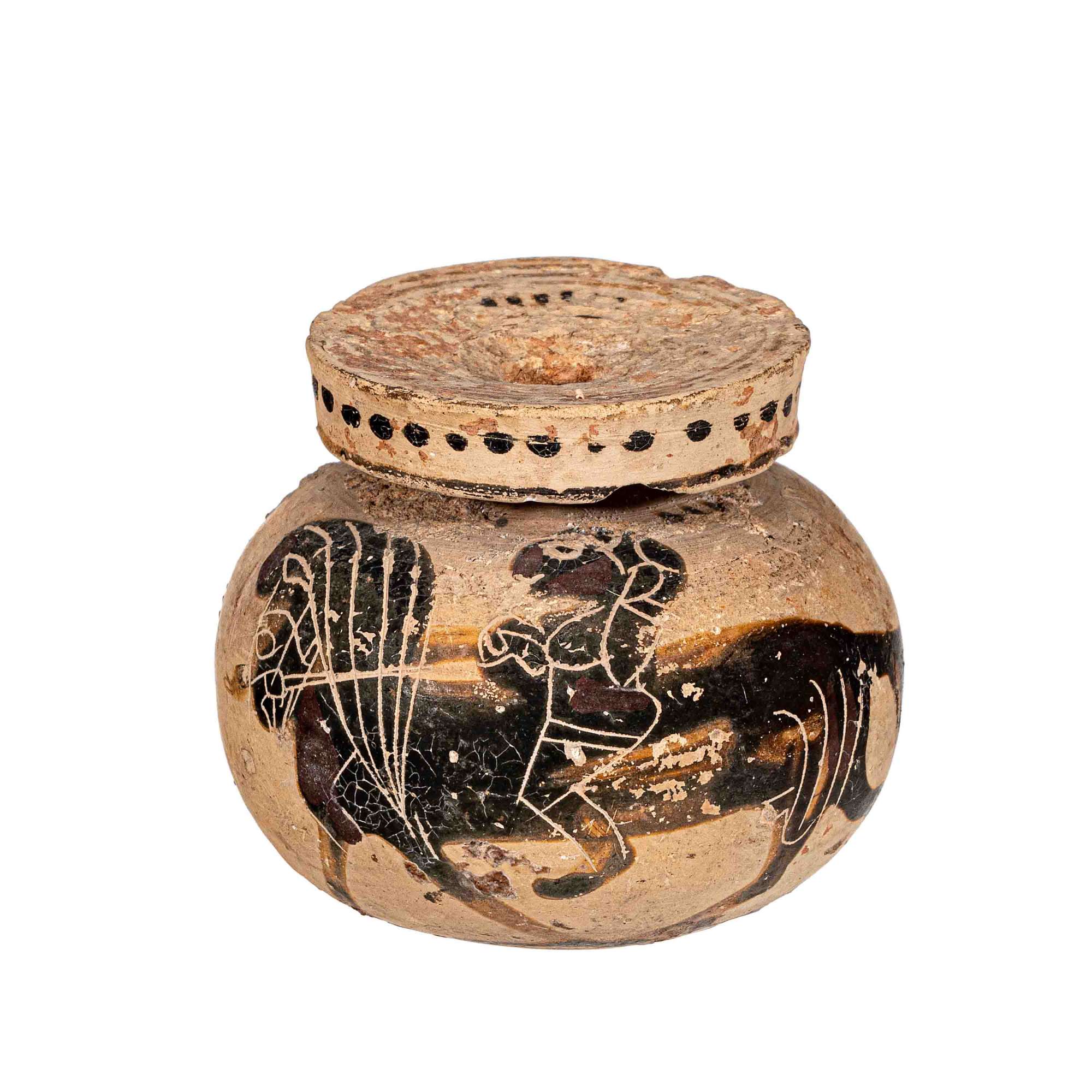 Aryballos corinzio con cavallo dalla folta criniera verso sinistra e cavaliere con elmo; sulla base disegna a ruota.