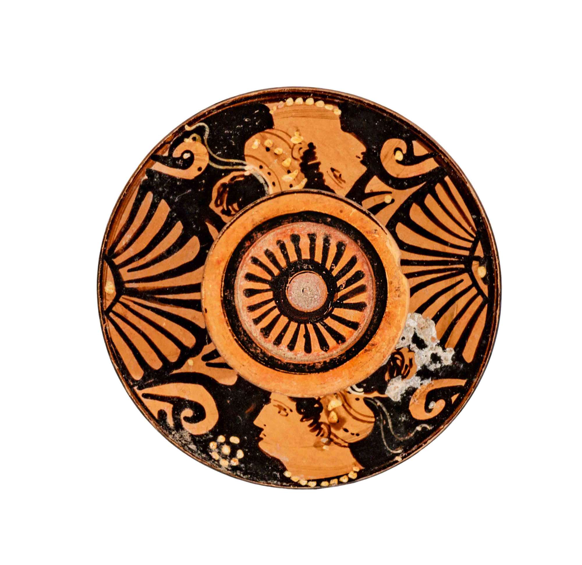 Presa con orlo revoluto modanato; tondo centrale ribassato, inclinato verso il tondello mediano incavato; stelo dal profilo leggermente concavo, con l’attacco con la calotta appena insellato; spalla obliqua; orlo verticale dal profilo leggermente concavo e rastremato verso l’interno. Sulla presa, entro due circonferenze concentriche a vernice nera, motivo a raggiera in nero; circonferenza superiore della presa a risparmio; bordo verticale della presa verniciato (in parte evanido evanido) nella parte superiore; stelo verniciato in nero con fascia a risparmio all’attacco con la calotta. Appoggio e interno della calotta lasciati a risparmio; parte inferiore della presa e parte dello stelo sempre a risparmio. Ai lati dei due quadranti metopali, palmette speculari con foglie squadrate alle estremità, unite da calice centrale a ogiva a risparmio con punto giallo inscritto. Le palmette sono accompagnate ai lati da foglie spiraliformi e da infiorescenze triangolari puntinate in giallo. Nei riquadri metopali coppia speculare di teste femminili con mitra