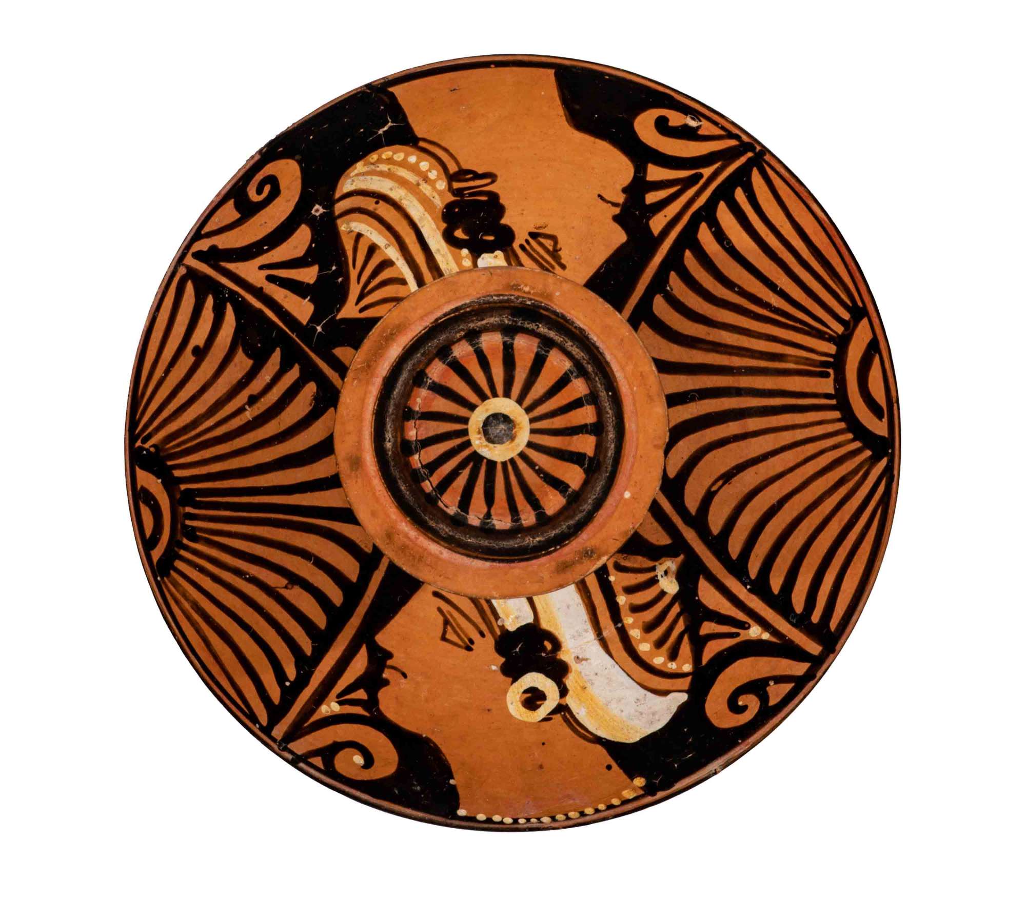 Coperchio di lekanis a figure rosse ed elementi bianchi; testa femminile con mitella tra palmette