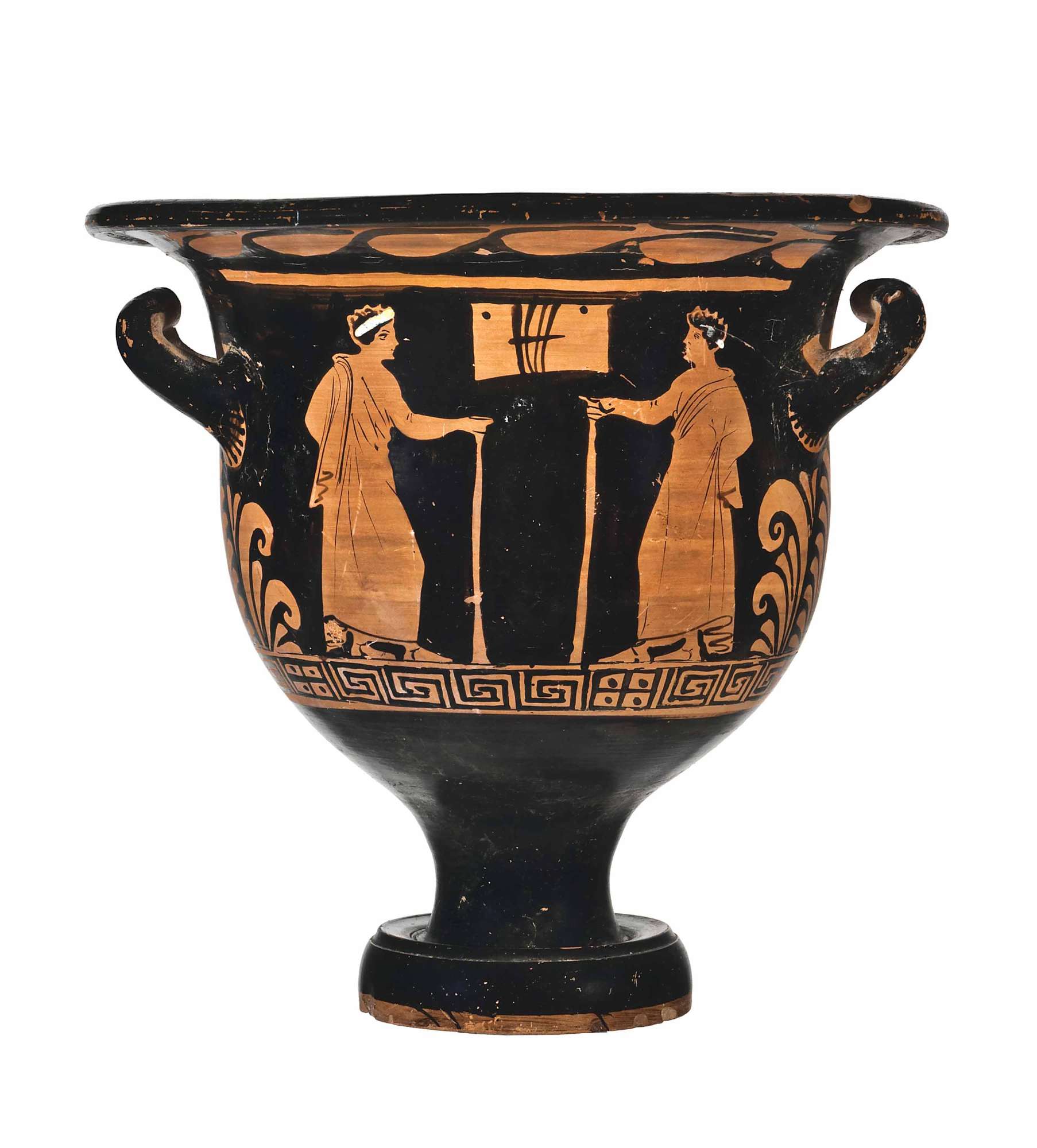 Cratere a campana. Orlo estroflesso, distinto dalla vasca da una lieve mondatura evidente al tatto; labbro arrotondato, a sua volta distinto dall'orlo da una sottile mondatura a cavetto. Anse a sezione circolare impostate orizzontalmente e rialzate; piede ad echino cavo, incavato all'attacco con lo stelo e modanato alla sommità Lato A: Eros seduto con fiaccola e menade stante. Eros seduto di tre quarti verso sinistra su roccia sovradipinta in bianco e giallo con infiorescenze sulla base; regge nella mano destra sollevata una fiaccola accesa ( con fiamma evanida), mentre la mano sinistra poggia sulla seduta.Il dio è nudo e indossa calzari chiusi con dettagli sovradipinti sul collo del piede e sui calcagni. Nelle ali il piumaggio è decorato con punti e tratti sovradipinti. Sulla sinistra, menade stante vestita con un chitone stretto in vita. I piedi sono calzati con delle basse embades, la chioma raccolta in una mitra, con nastri bianchi sovradipinti. Le braccia sono allargate e sul palmo della mano sorregge una phialè decorata presso l'orlo e sulla breve vasca rispettivamente da una linea metopale risparmiata di spessore irregolare, grappolo d'uva con tralcio e foglia nastri. Sempre nella mano sinistra regge una ghirlanda, costituita da una fila di tre rosette sovrapposte a sei petali con bottone centrale, da cui si dipartono tre rami; due, resi con file di puntini, sovradipinti in bianco e giallo con infiorescenze. Nel campo, in alto a destra finestra strombata profilata in bianco. Lato B: Due giovani ammantati a colloquio. Ambedue appoggiati al bastone, sono stanti, di profilo e affrontati. Entrambi hanno la testa cinta da una benda sovradipinta in bianco e indossano un himation bordato e drappeggiato trasversalmente che lascia spalle e braccia destro scoperte e forma un fascio di pieghe parallele intorno al busto.