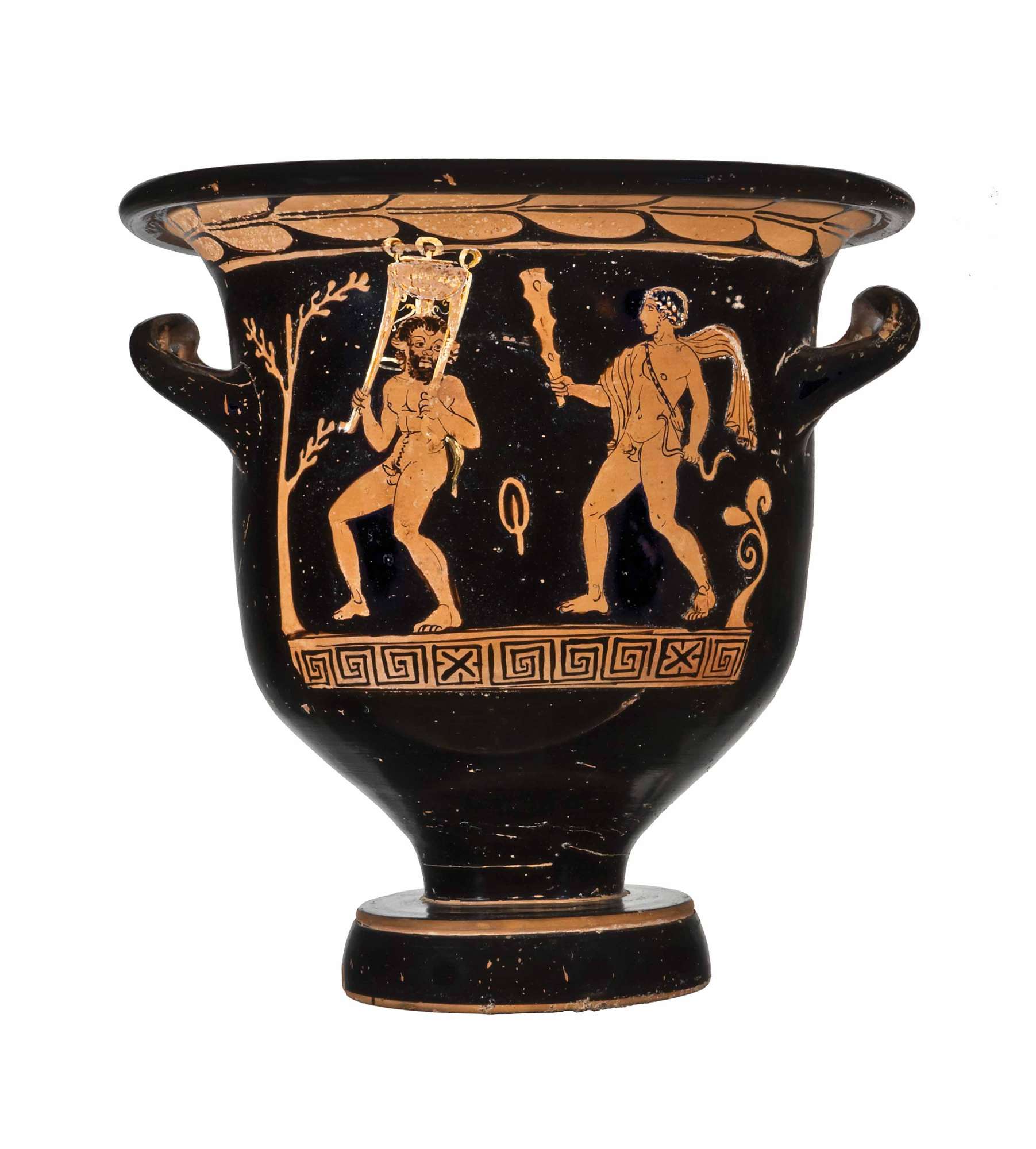 Cratere a campana a figure rosse. Lato A: parodia della contesa del tripode: Eracle con clava insegue Sileno con tripode sulle spalle; Lato B: due giovani vestiti di mantello.