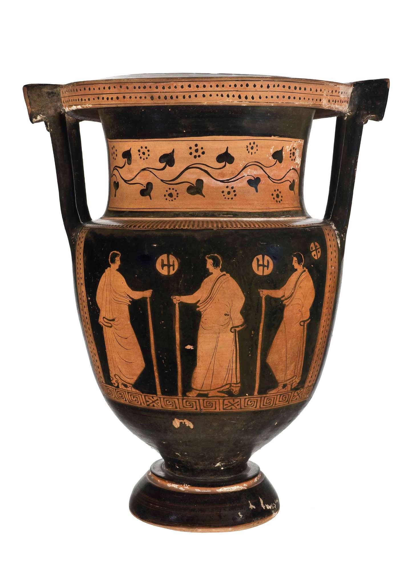Cratere a colonnette apulo a figure rosse; fasce di meandri, puntini e serto d'edera sul collo. Lato A: scena di offerta: guerriero con scudo e lancia, guerriero piegato in avanti con scudo e serto; donna con patera, offerte e situla; donna con grappolo d'uva e patera. Lato B: tre giovani ammantati, due halteres e palla.