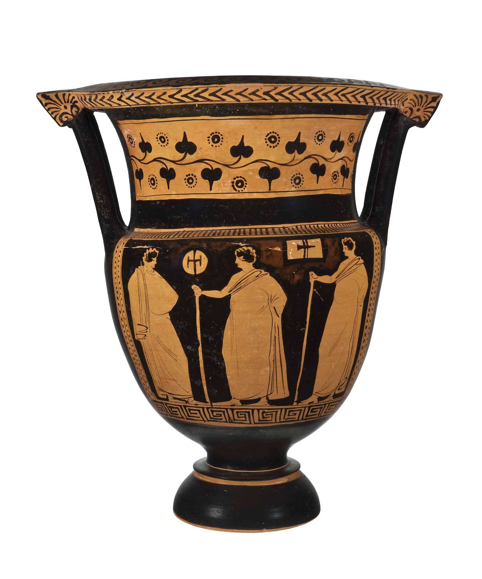 Cratere a colonnette apulo a figure rosse: decorazione a serto d'edera sul collo. Lato A>: scena d'offerta: donna seduta con patera e oinochoe; guerriero stante con scudo e lancia>; secondo guerriero con scudo, lancia e pilos. Lato B: tre giovani ammantati e coppia di halteres e dittico con stilo.