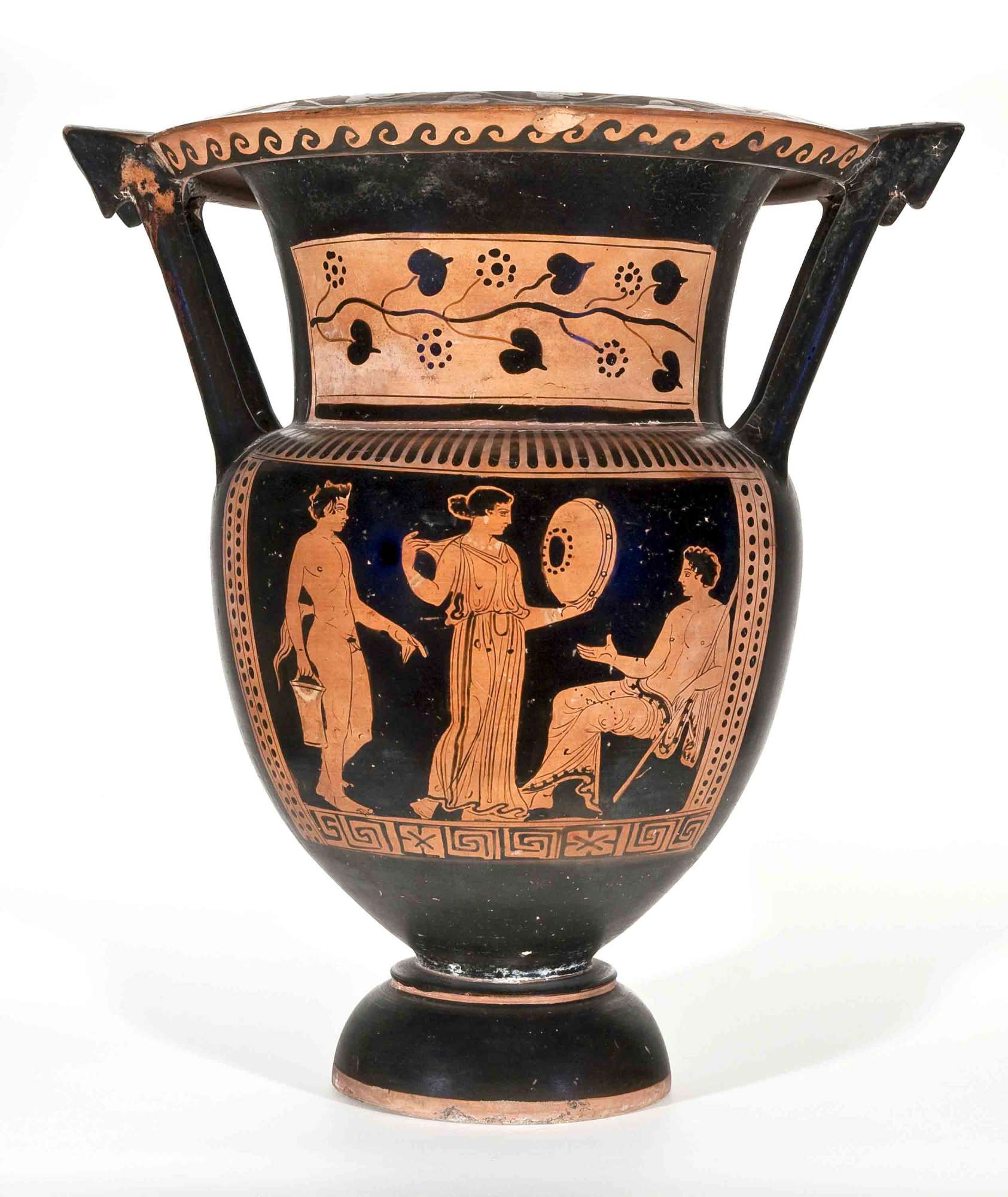 Cratere a colonnette apulo a figure rosse. Lato A: Dioniso seduto con tirso, menade stante con timpano, satiro con situla. Lato B: tre giovani ammantati, coppia di halteres.