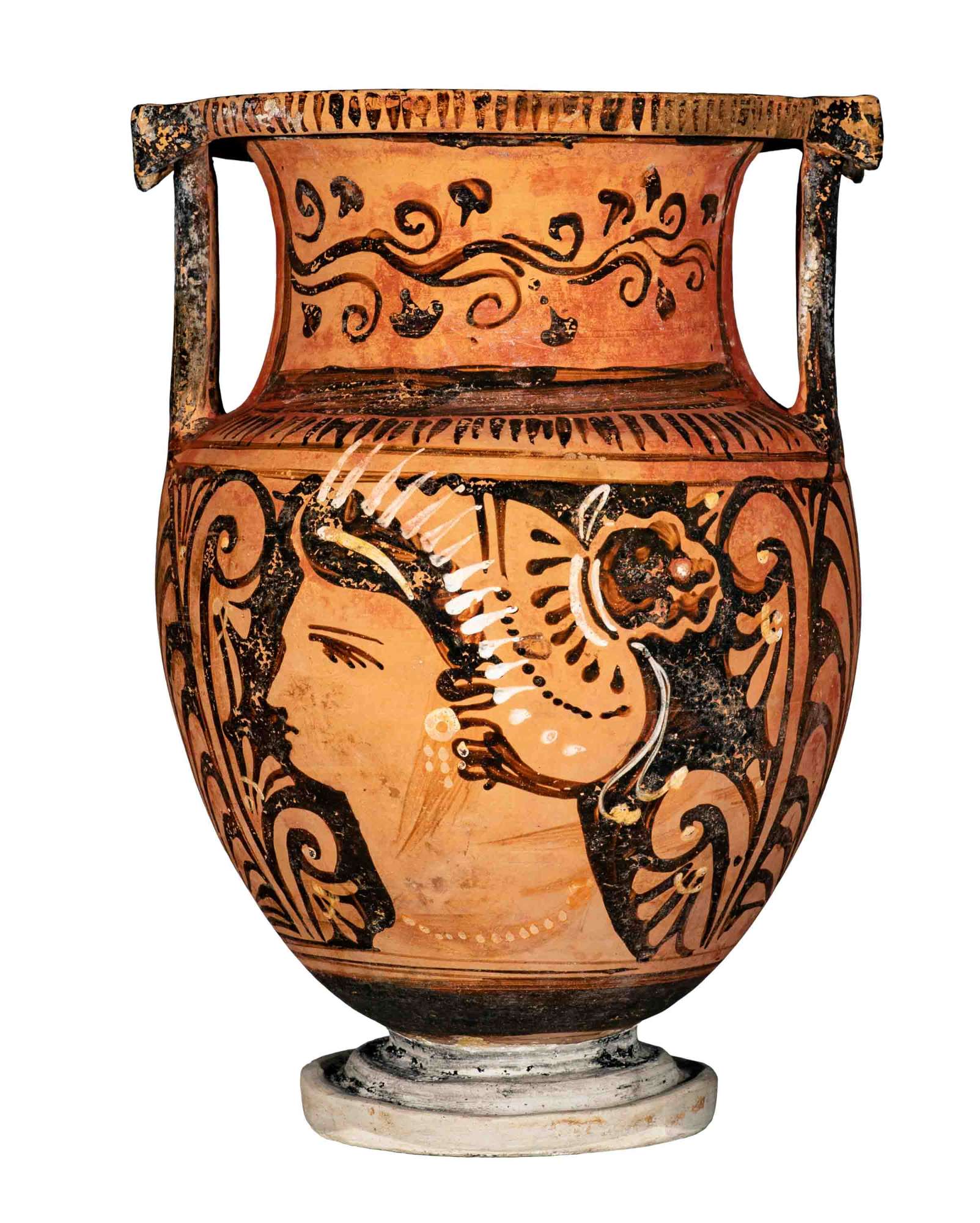 Cratere a colonnette apulo a figure rosse. Sul collo serto d'edera nero su fondo rosso. Lato A e B: testa femminile con mitella tra palmette.