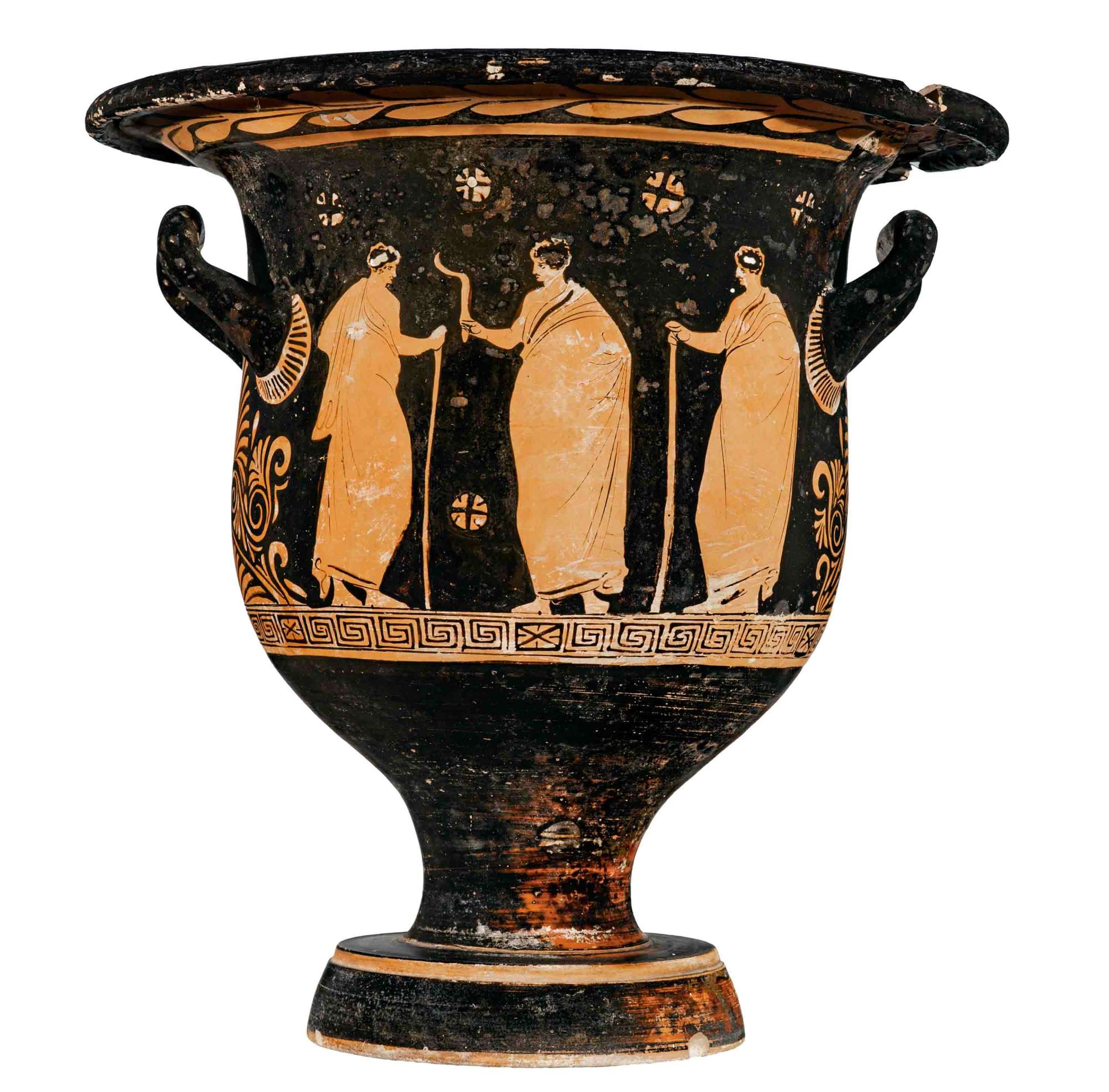 Cratere a campana apulo a figure rosse. Lato A: una fanciulla in chitone, appoggiata ad una stele, guarda un giovane nudo seduto con patera e tirso nelle mani, a sinistra una seconda fanciulla con timpano e tirso, a destra satiro con situla; Lato B: tre giovani ammantati