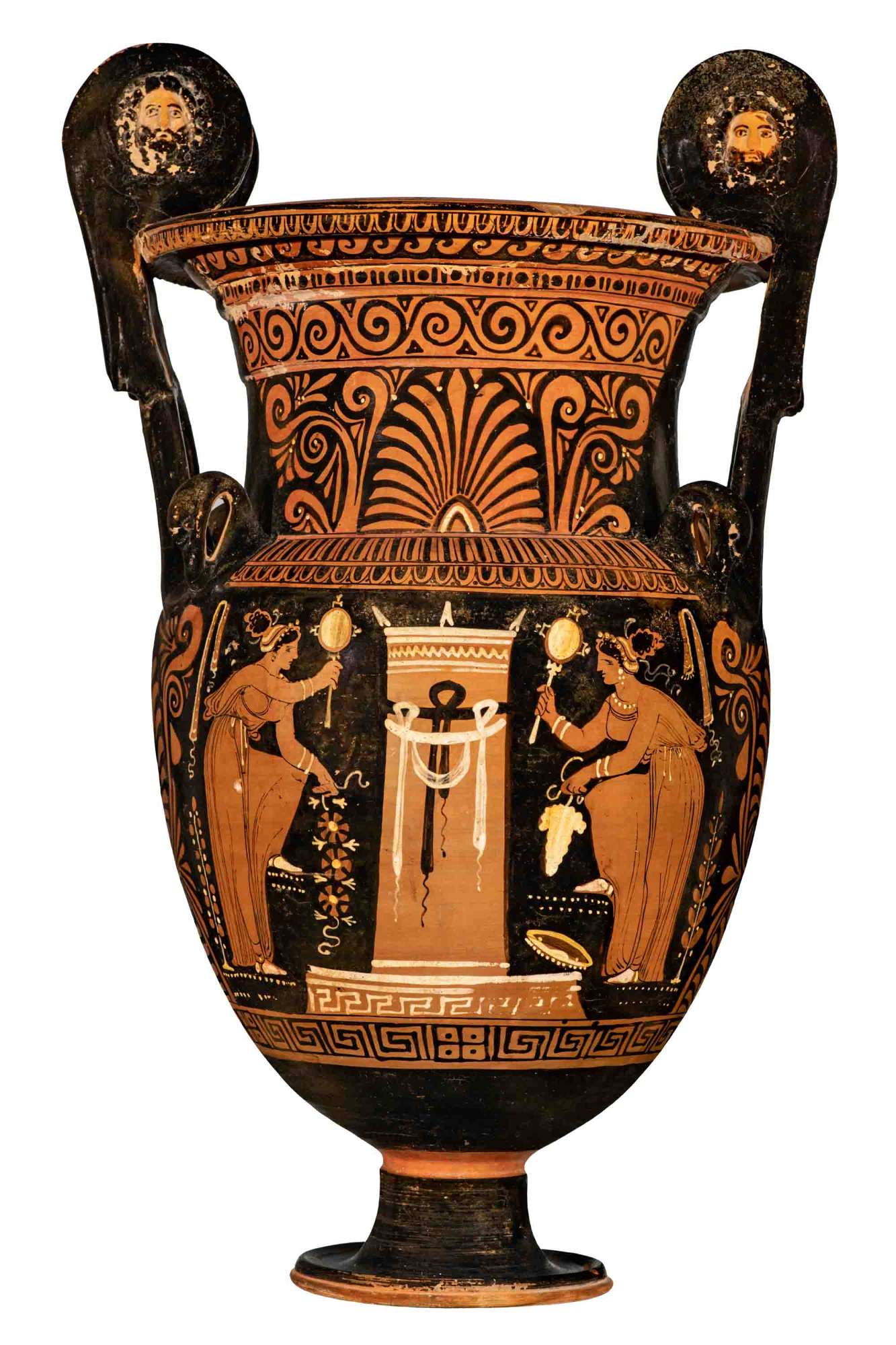 Cratere a volute con mascheroni e attacchi d'ansaa teste di cigno, a figure rosse. decorazione a fasce di meandri, ovuletti, palmette e onde marine. Lato A: offerta a defunta vestita di chitone e assisa in edicola seduta con cista e palla in una mano, ai lati due donne con uno specchio; sul collo testa femminile tra tralci e fiori. Lato B: scena di offerta alla tomba: cippo con due acroteri e bende legate intorno alla struttura; ai lati due donne offerenti uno specchio.