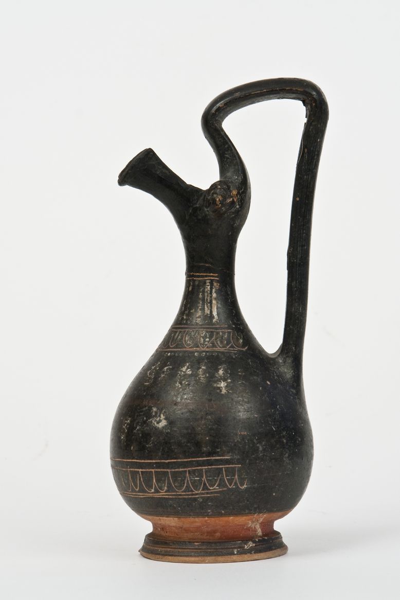 Epichysis globulare a vernice nera con sovraddipinture in bianco giallo e rosso amaranto ed incisioni. Bocchello a labbro revoluto, collo cilindrico, corpo piriforme schiacciato in basso, ansa a nastro sormontante, gola di raccordo, piede troncoconico modanato al taglio. Sul collo: tra tre coppie di linee incise, bastoncelli, grappoli, pampini, viticci e germogli in bianco giallo. Alla base del corpo piriforme, motivo degli ovuli incisi e dipinti con punti tra due coppie di linee incise.