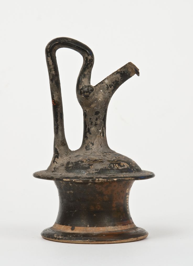 Epichysis a rocchetto a vernice nera con sovraddipinture in giallo oro e bianco. Lungo beccuccio con labbro distinto modanato, stretto collo cilindrico con piccola modanatura alla base, corpo cilindrico a profilo concavo, ansa a nastro sormontante, piede a disco. Sul collo: sequenza di bastoncelli e fila di punti (alla base del collo, sotto la piccola modanatura) dipinti in bianco (o giallo su base bianca, se si ipotizza che il giallo sia saltato). Sulla spalla: tralcio di edera di tipo New Ivy, con stelo sinuoso dipinto e rosette di punti in giallo oro; sulla flangia meandro merlato dipinto in giallo oro. Sul corpo cilindrico: grappolo centrale in bianco-giallo tra due coppie di cerchi disposti su una serie di linee orizzontali digradanti.