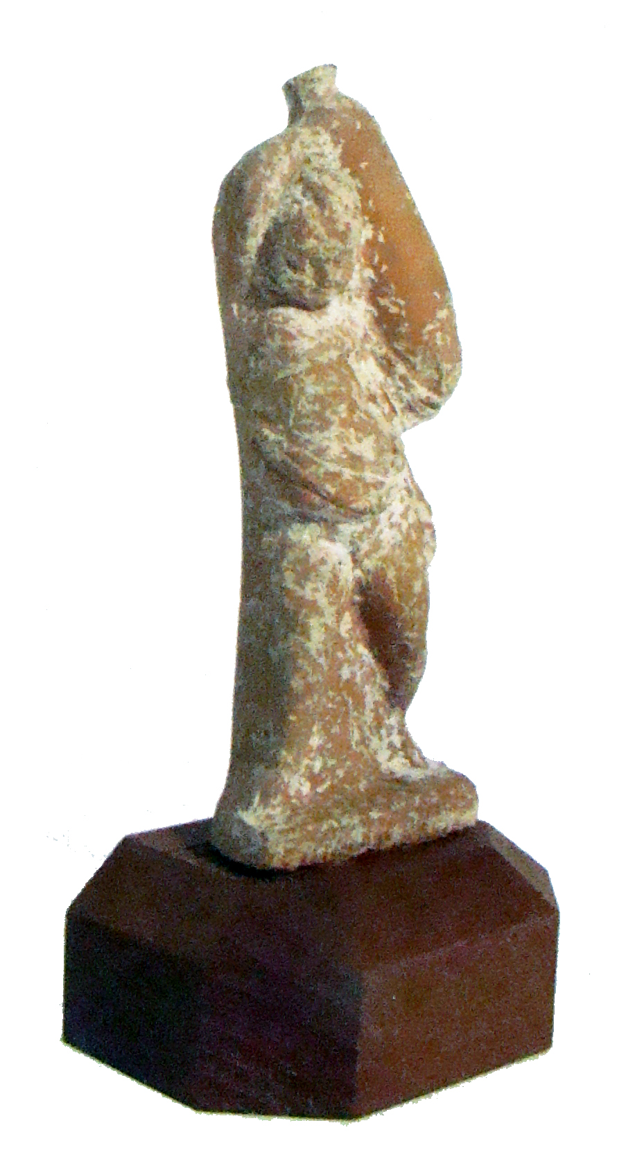 Figura fittile, realizzata a matrice. Cava. Sul retro cavità circolare. Sul retro reca la scritta in matita "100, 7" e quella in rosso "642, 5088". Sul fianco della basetta lignea moderna è applicata un'etichetta con il numero "642". Figurina infantile, nuda che sorregge sulle spalle un'anfora oblunga.