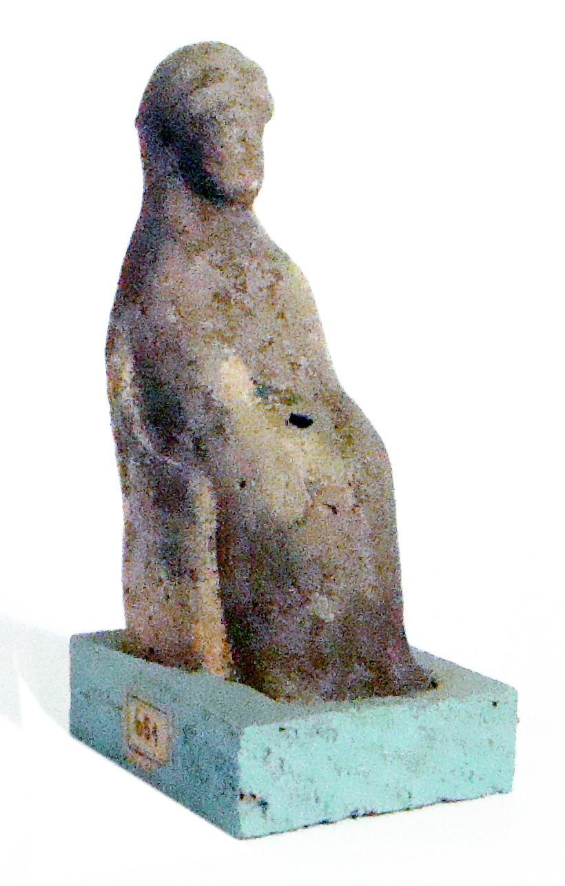 Statuina in terracotta, di colore bruno, realizzata a matrice. Retro non lavorato. Presenta sul retro la scritta in rosso "651 5099". Alloggiata su una basetta moderna quadrangolare lignea. Sul lato destro della basetta riporta la scritta in stampatello minuscolo "Grecia 5099". Riporta poi l'etichetta con il numero "651". Sotto la base è apposta una seconda etichetta con la scritta in corsivo "28 febbr 74". Figura femminile seduta, braccia distese lungo il corpo e mani appoggiate sulle ginocchia. Appena intuibile il trono. Nessun particolare del corpo è evidente. Accennati naso e arcata sopracciliare. Capelli con scriminatura centrale divisi in due bande sopra la fronte. Diadema e velo.