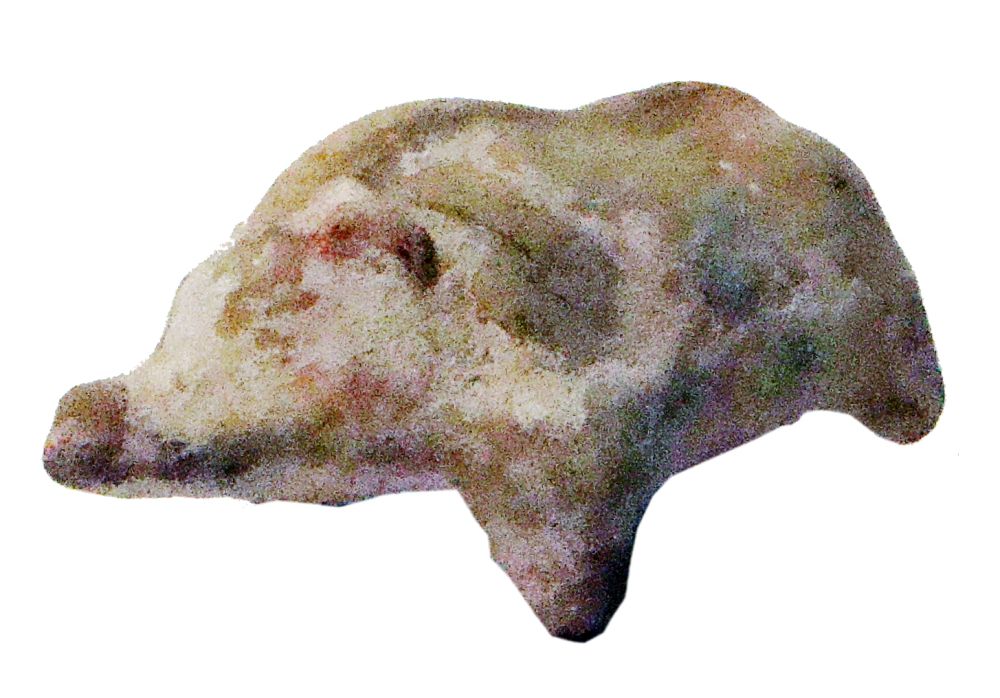 piccola figura di maiale realizzata in due metà con interno cavo per contenere il nucleo. La resa semplificata sottolinea l'aspetto selvatico dell'animale dal dorso irto, piccole orecchie, grugno a bottone e quattro zampe stilizzate di cui una mancante.